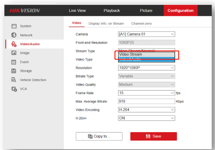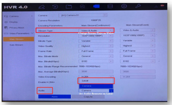 3. Nếu bạn không muốn thay đổi camera, vui lòng thay đổi Loại luồng camera từ video & âm thanh thành video và đặt tài nguyên âm thanh DVR làm cục bộ để giải quyết vấn đề.
