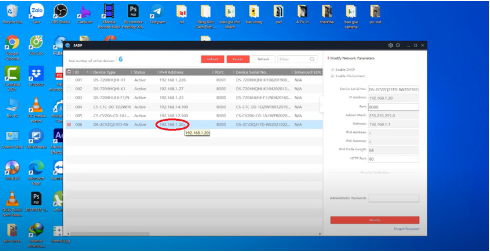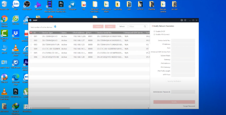 Bước 1: Bạn truy cập vào phần mềm SADP đã cài đặt trên máy tính. Trong phần mềm này sẽ có một loạt các camera bạn đang sử dụng cùng IP tương ứng.