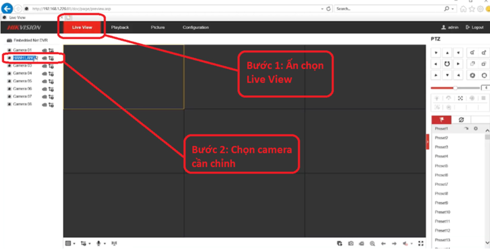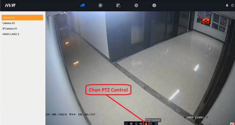 Chọn camera cần chỉnh → Phóng to camera cần chỉnh → Nhấn PTZ Control