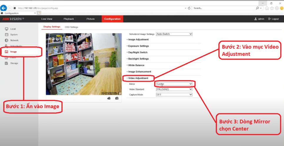 Bước 4: Bạn chỉnh lại hình ảnh hiển thị của camera bị ngược bằng cách vào Configuration → mục Image → mục Video Adjustment.