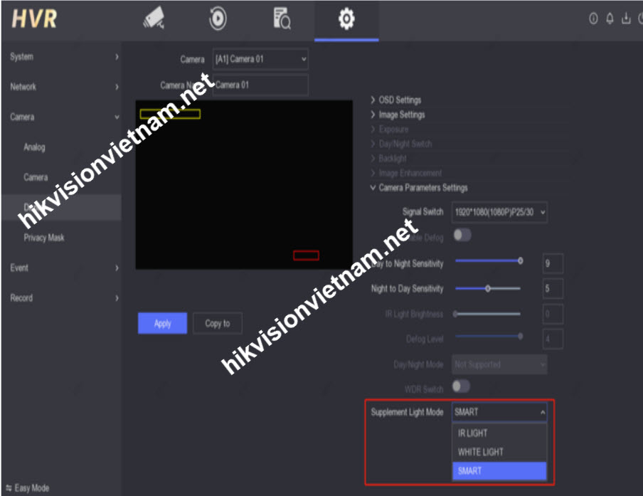 Configuration - Camera - Display, nhấp vào Supplement Light thả xuống Chế độ ánh sáng bổ sung và thay đổi chế độ ánh sáng bổ sung.
