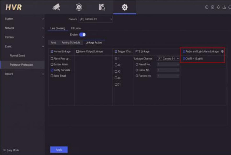 Cấu hình chế độ ánh sáng trên menu OSD, sau đó định cấu hình liên kết sự kiện trên DVR: