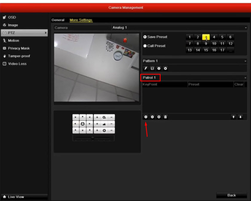 Sau khi các bạn lưu các địa điểm xong các bạn bắt đầu thiết lập thời gian và tốc độ xoay. Trong mục Patrol 1 các bạn bắt đầu thêm các điểm đã lưu vừa rồi và chỉnh thời giam tốc độ quay bằng cách kích vào hình tròn (mũi tên màu đỏ bên dưới)
