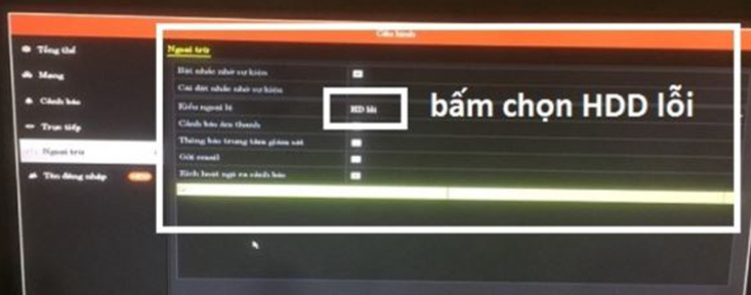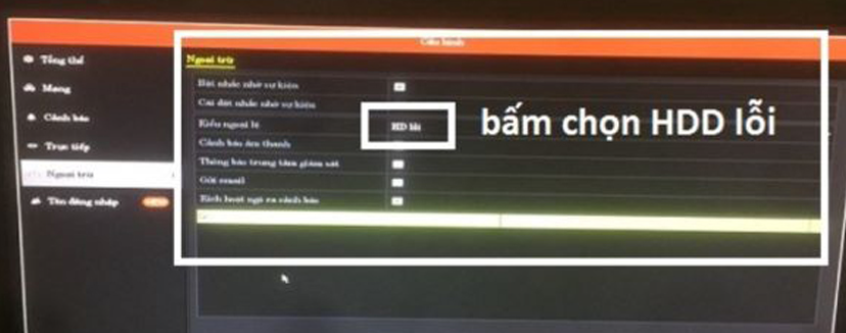 Tại dòng Kiểu ngoại lệ đang hiển thị Full HD → đổi sang “Lỗi HDD”.