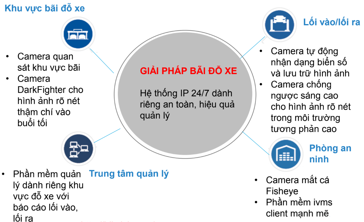 Giải pháp giám sát bãi đỗ xe của Hikvision mang lại sự an toàn khu vực bãi đậu xe. Với nhiều chức năng thông minh, báo cáo thống kê, quản lý truy cập tự động. Phần mềm quản lý trung tâm mạnh mẽ, camera chụp lại hình ảnh có màu sắc trong điều kiện môi trường ánh sáng yếu, tự động nhận dạng biển số. Hikvision cung cấp mọi thứ cho khu vực bãi đỗ xe đảm bảo hiệu quả, quản lý thông minh 24/7.