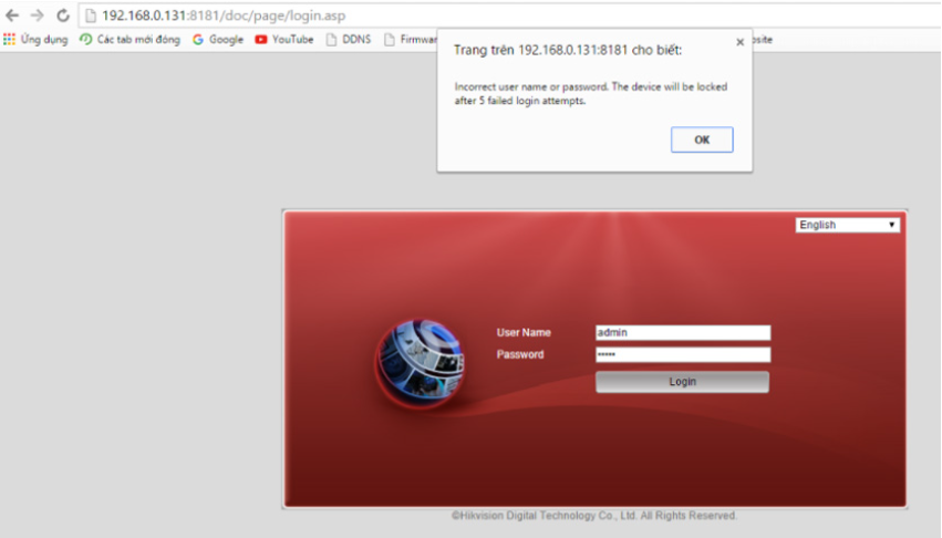 Camera Hikvision bị khóa do trường hợp 2, 3 ở trên, bạn vẫn nhớ đúng mật khẩu thì chỉ cần truy cập lại và nhập mật khẩu, tên người dùng chính xác để đăng nhập.