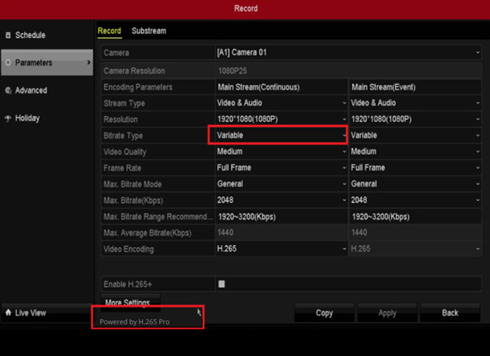 Người dùng thực hiện bằng cách vào phần mềm đầu ghi → đến mục Parameters → chuyển trạng thái của Bitrate Type sang Variable → xem thông tin ở góc dưới bên trái giao diện đã có dòng Powered by H.265 Pro hay chưa → bấm chọn Apply để hoàn tất.