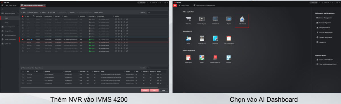 Bạn thêm NVR vào phần mềm sau đó chọn vào AI Dashboard mở bảng hiện thị các tính năng thông minh