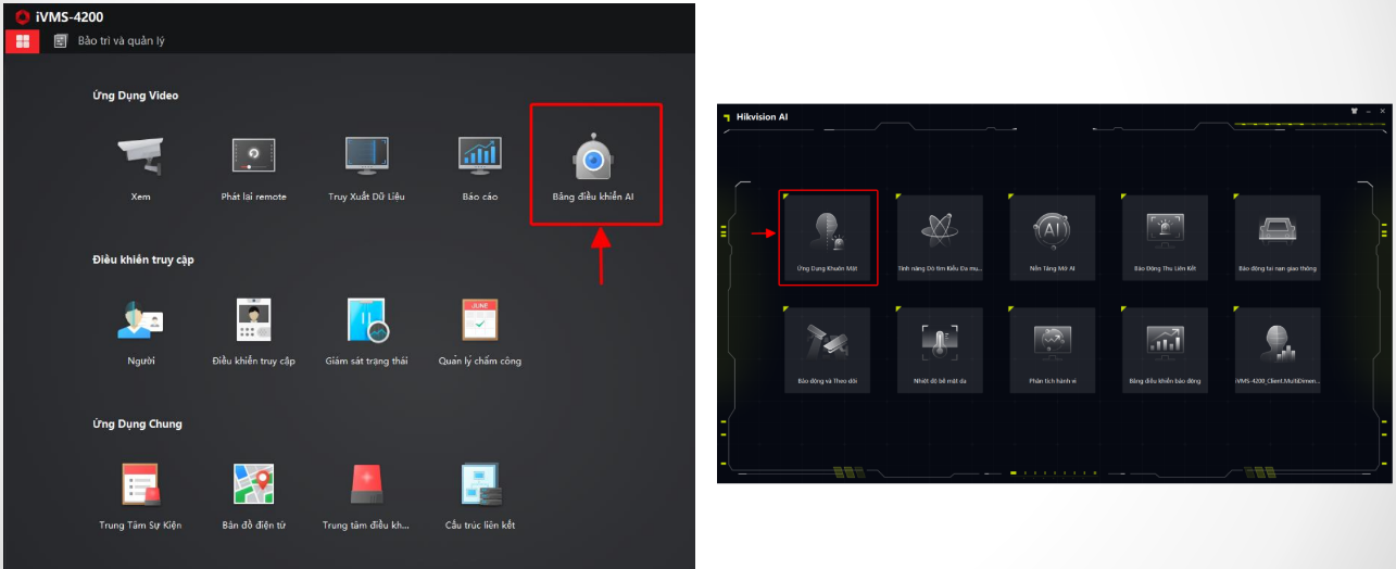 Bước 2 : Chọn “Bảng điều khiển AI” – chọn tiếp “Ứng dụng khuôn mặt” để bật chế độ xem trực tiếp so sánh khuôn mặt
