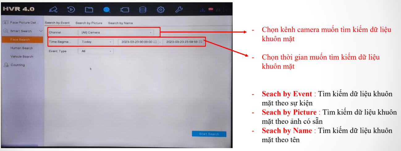Chọn “Smart Seach” – “Face Seach” – chọn thông tin muốn tìm kiếm và bấm “Start Seach”