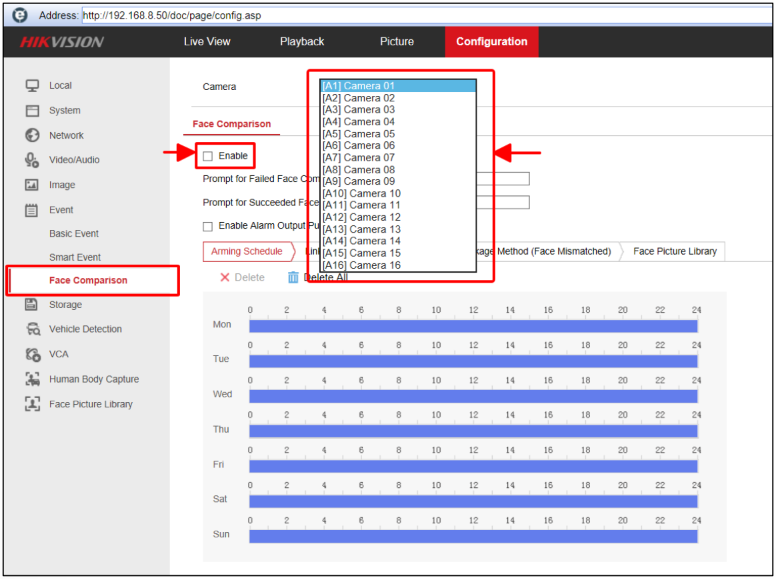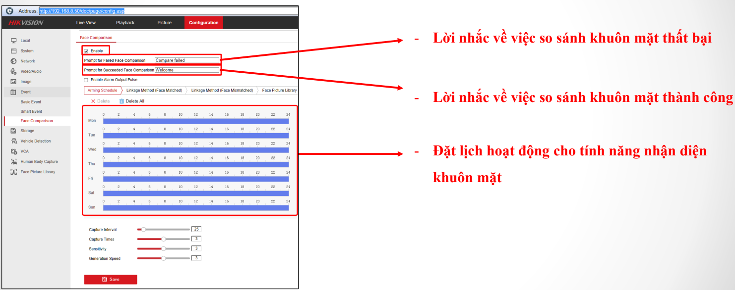 Chọn Configuration – Event – tính năng“Face Comparison” – chọn kênh camera muốn so sánh gương mặt - chọn “Enable”