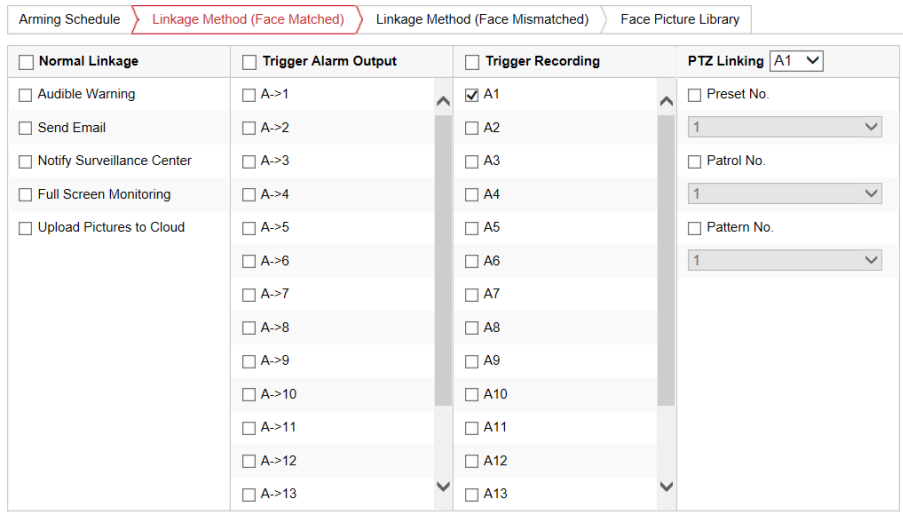 Linkage Method (Face Matched) : những hành động liên kết sẽ được thực hiện khi phát hiện khuôn mặt thành công