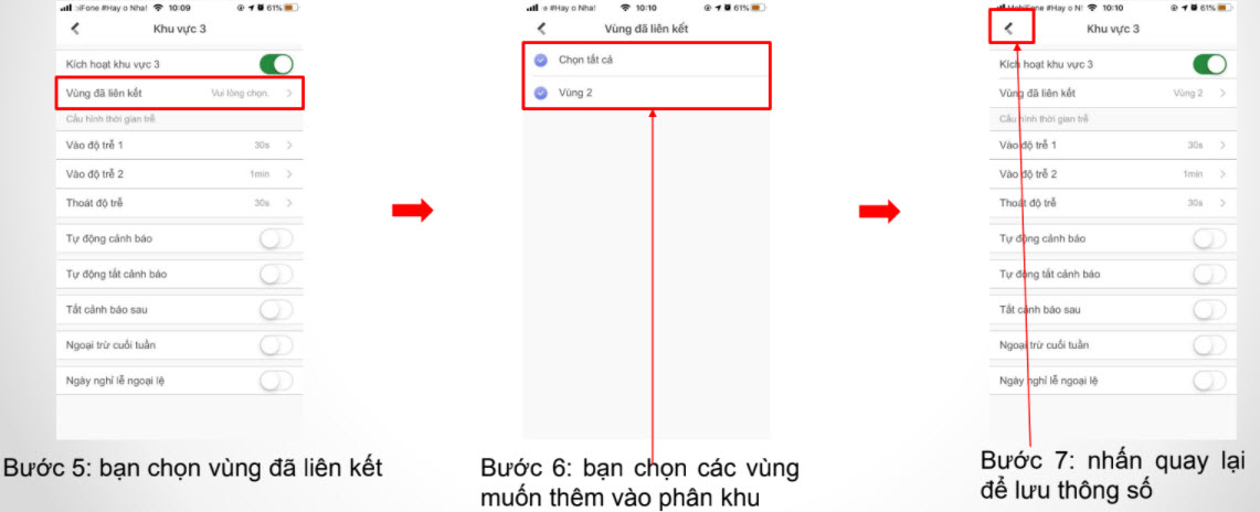 Tại các phân khu mới được mở, bạn có thể thêm vùng riêng hoặc có thể chọn các vùng được thêm ở các phân khu khác (các phân vùng này đã được bỏ chọn và không thuộc về bất cứ phân khu nào). Để chọn vùng liên kết vào phân khu bạn vào mục “Vùng đã liên kết” và chọn các vùng còn trống sau đó bấm quay lại để lưu lại thông số.