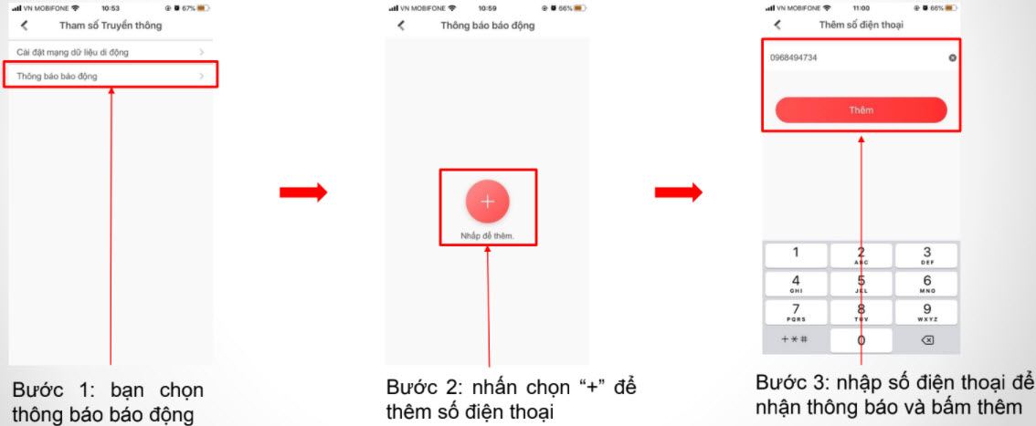 Để cấu hình số điện thoại nhận được cuộc gọi và SMS báo động bạn làm theo các bước sau