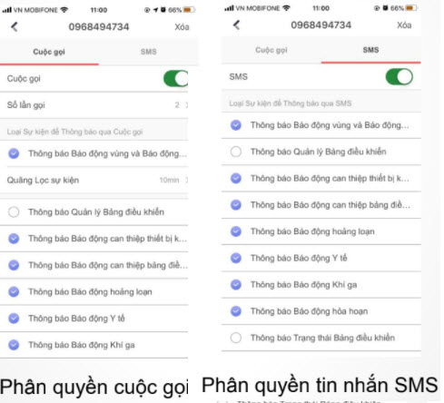 Sau khi bạn thêm số điện thoại, tủ trung tâm cho phép bạn phân quyền số điện thoại này có thể nhận được các thống báo nào khi gọi điện. Ngoài ra cho phép bạn cấu hình những thông báo bạn có thể nhận được thông qua SMS.