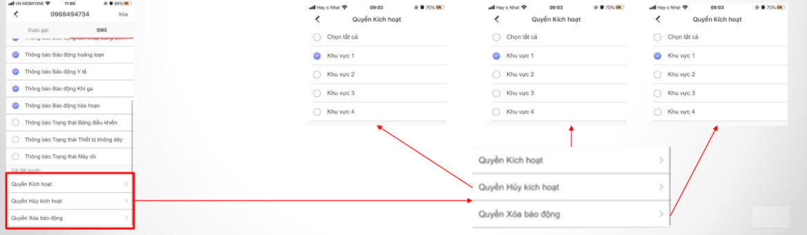 Riêng ở mục SMS bạn có thể phân quyền cho số điện thoại có thể gửi tin nhắn để bật/tắt và xóa báo động ở các phân khu. Mục cài đặt quyền có những phân quyền: