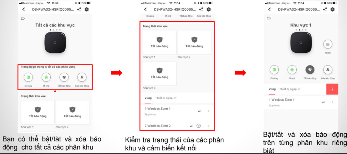 Trên ứng dụng Hik-Connect cho phép bạn bật tắt báo động các phân khu với các phân quyền riêng biệt. Ngoài ra bạn có thể kiểm tra trạng thái các vùng được gán vào trên tủ trung tâm.