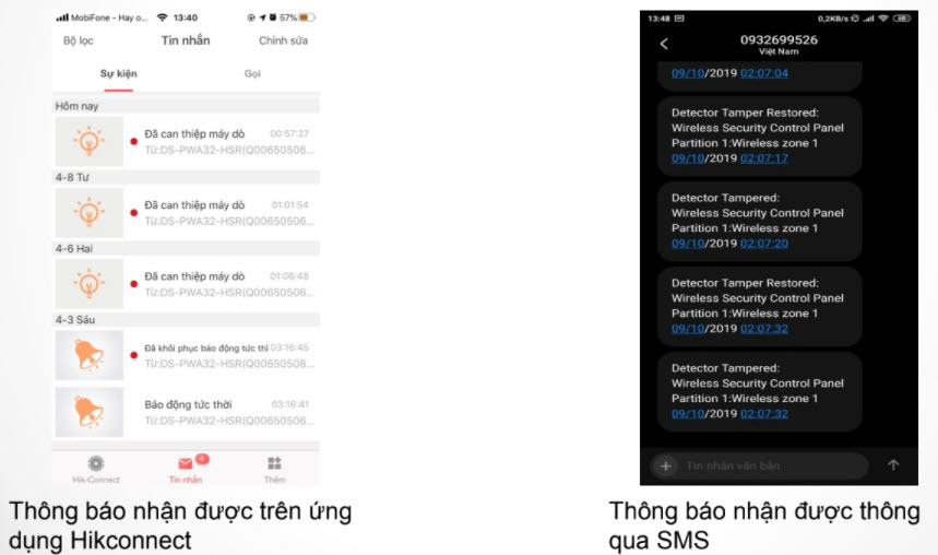 Khi có sự kiện tủ trung tâm sẽ gửi thông báo trực tiếp về trên tài khoản Hikconnect. Ngoài ra khi có báo động bạn sẽ nhận được cuộc gọi và SMS thông báo về các sự kiện đã cài đặt đến những số điện thoại đã cài đặt.