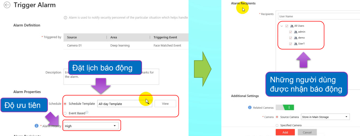 Tạo báo động -> đặt lịch -> chọn người dùng