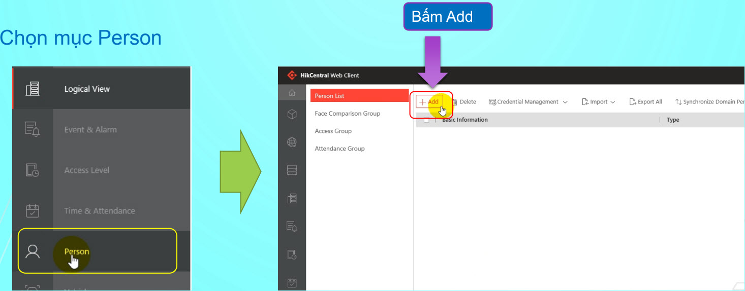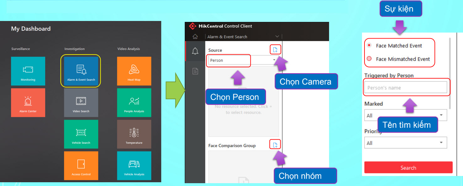 Chọn Person -> thêm camera, nhóm, sự kiện, tên người, thời gian -> search