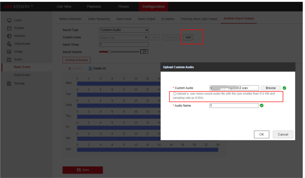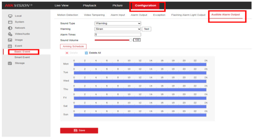 Đường dẫn cấu hình: 【Configuration】->【Event】->【Basic Event】->【Audible Alarm Output】
