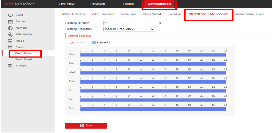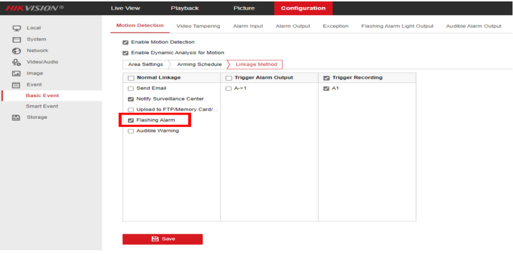 Đường dẫn cấu hình: 【Configuration】->【Event】->【Basic Event】->【Flashing Alarm Light Output】