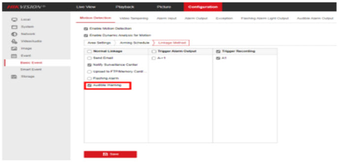 Đường dẫn cấu hình: 【Configuration】->【Event】->【Basic Event】->【Motion Detection】->【Linkage Method】->【Audible Warning】. Ở đây chỉ có đường dẫn liên kết cho phát hiện chuyển động được minh họa và các cài đặt liên kết sự kiện vành đai thông minh khác cũng tương tự.