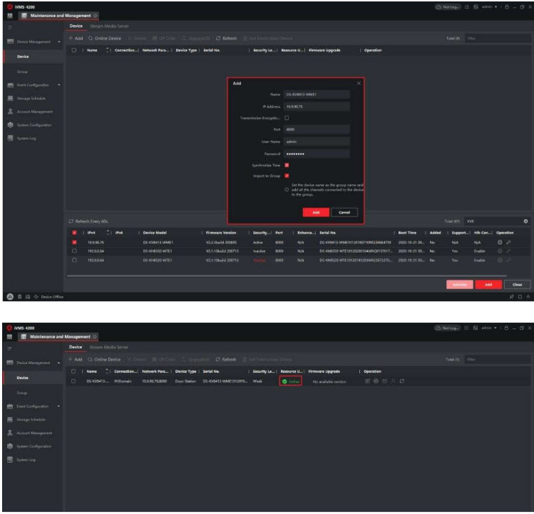 Tìm kiếm các thiết bị trực tuyến và thêm thiết bị vào iVMS-4200, nhập tên người dùng và mật khẩu, sau đó kiểm tra trạng thái.