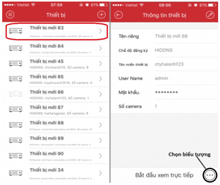 Chọn camera bạn muốn thay đổi mật khẩu → Màn hình hiển thị bảng thông tin thiết bị → Chọn biểu tượng “dấu 3 chấm”
