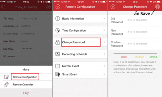 Chọn Remote Configuration → Chọn Change Password để thay đổi mật khẩu cho camera → Điền thông tin, ấn biểu tượng hình tròn bao quanh chiếc đĩa để hoàn thành đổi mật khẩu