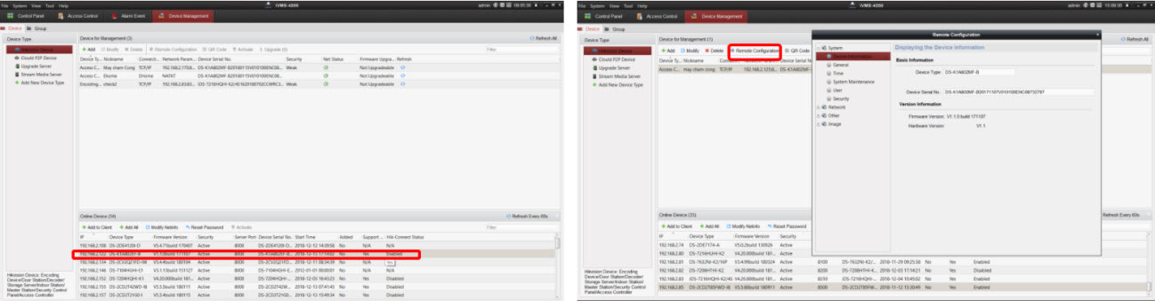 Sau khi gắn thiết thành công vào phần mềm IVMS 4200 bạn chọn thiết bị sau bấm vào Remoter Configuration để vào cấu hình máy chấm công
