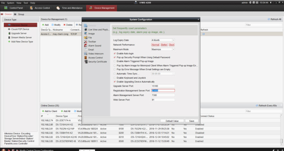 Bạn cần phải tùy chỉnh lại thông số Ehome trên phần mềm ivms 4200 bằng cách vào mục Tool->System configuration .Và ở trên mục Registrator Management Sever Port bạn đặt port trùng với với cấu hình Ehome đã khai báo