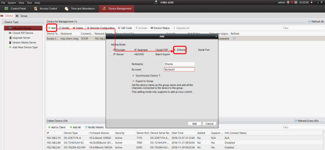 Bước 4 : trên máy chủ để có thể kết nối với máy chấm công từ xa . Bạn chọn Add-> Ehome sau đó bạn đặt tên thiết bị và nhập tài khoản đã tạo trên máy chấm công để có thể kết nối được
