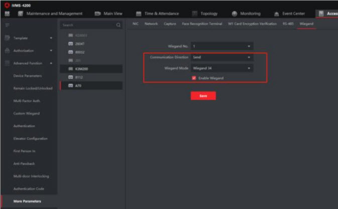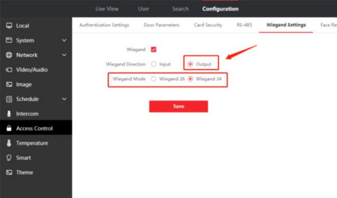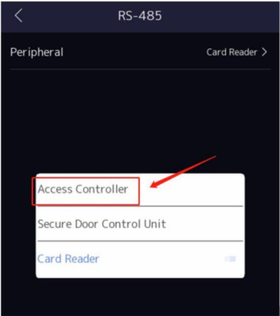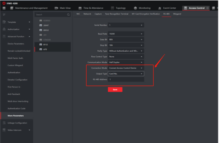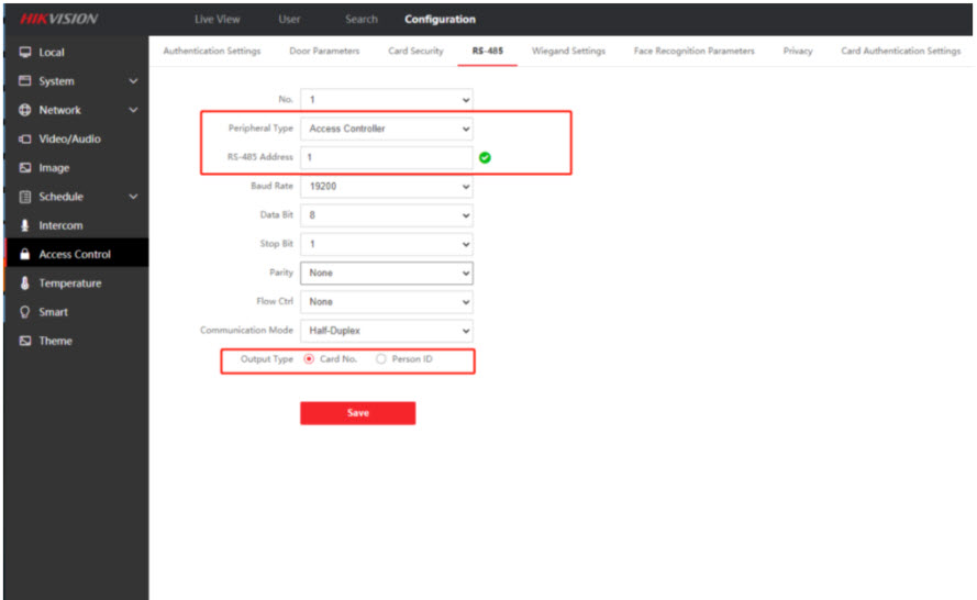 Chúng ta có thể chọn thực hiện cấu hình theo giao thức RS-485 trên giao diện cục bộ của thiết bị, giao diện nền tảng iVMS-4200 hoặc giao diện web, sau đó chọn bộ kiểm soát truy cập cho thiết bị bên ngoài, và chú ý đặt địa chỉ RS-485 tương ứng và chọn kiểu ngõ ra (Output type) là mã số thẻ (Card Number)
