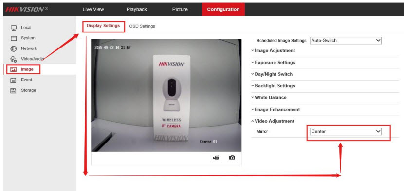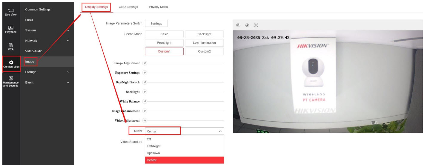 Đi đến Configuration --> Image --> Display Settings --> Video Adjustment, Mirror: chọn loại Center