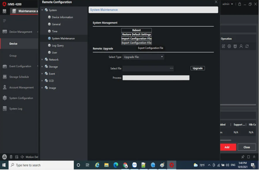 Chọn bảo trì thiết bị “System Maintenance” tiếp đến vào chọn “Export configuration File” xuất 1 file có đuôi ” .Bin “.