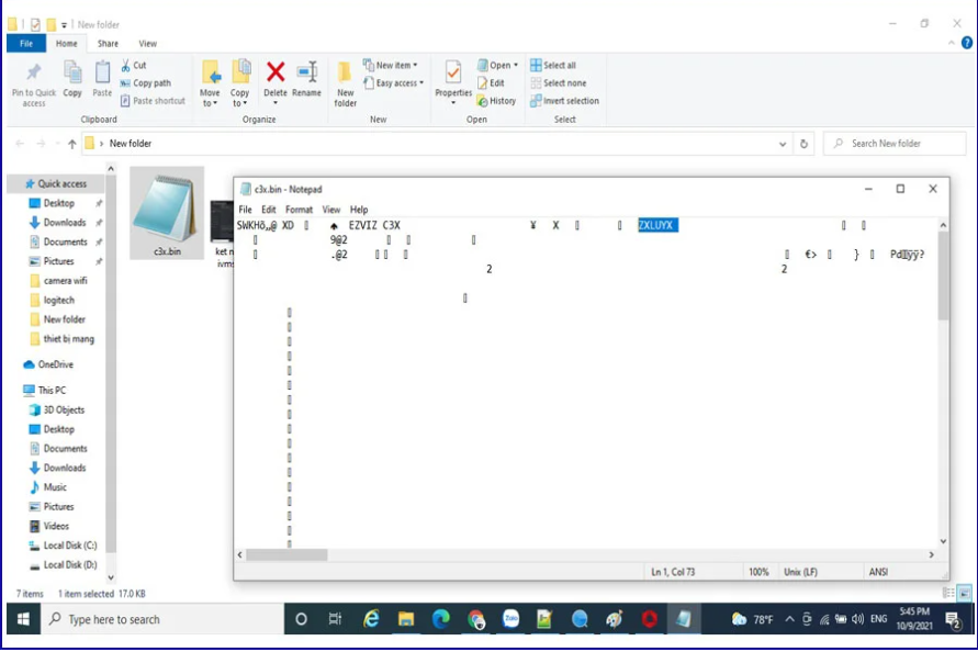 Mở file .bin bằng notepad và ta sẽ tìm được những thông tin : Serial Number, mã xác thực Ezviz, Mật khẩu vừa đặt trên phần mềm SaDP tool