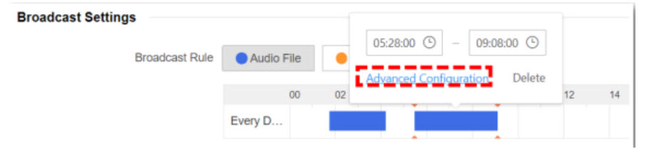 Ở đây, chúng ta sẽ cấu hình một lịch trình theo ngày làm ví dụ. Chọn khoảng thời gian và nhấp vào Cấu hình Nâng cao để vào trang cài đặt chi tiết phát sóng.