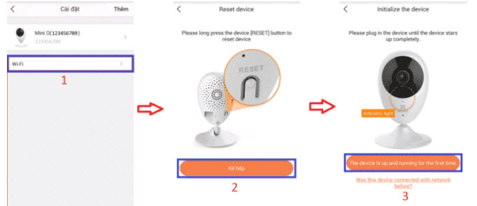 Trong giao diện phần mềm => Vào phần cài đặt Camera Ezviz ( khi camera đã mất kết nối ) => Chọn Wifi => Kế tiếp => “The Device Has been Started”