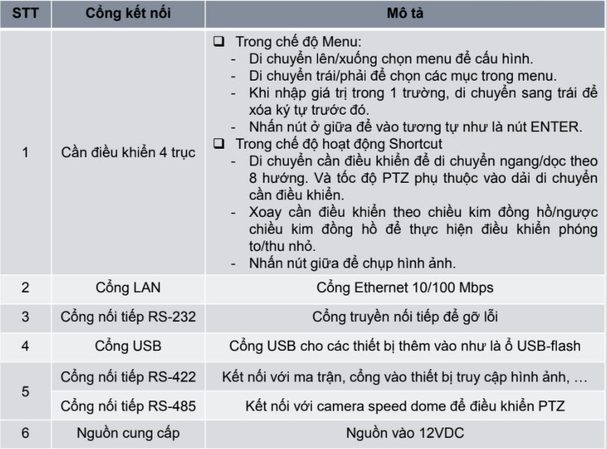 Bảng 1 – Mô tả các cổng kết nối phía sau.