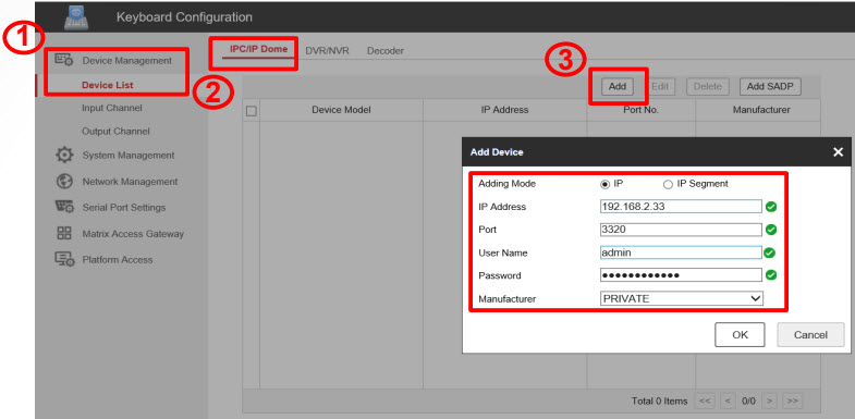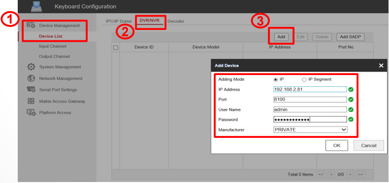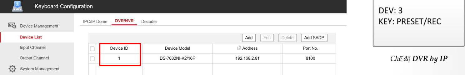 Nhấn các nút Num + DEV trên bàn điều khiển để chọn ID thiết bị (xem trong mục Device Management -> Device List -> DVR/NVR)