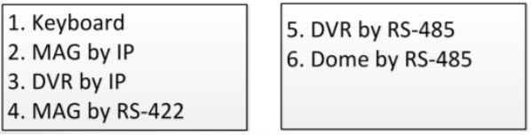 RS-485/RS-422: Giao diện thiết lập RS-485/RS-422. Cho phép kết nối camera analog dome hoặc DVR với bàn điều khiển qua cổng nối tiếp RS-485 và MVC/MAG với bàn điều khiển qua cổng RS-422.