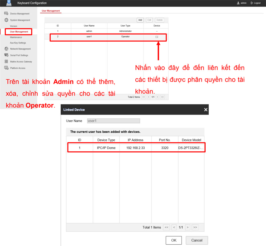 Giao diện quản lý tài khoản operator