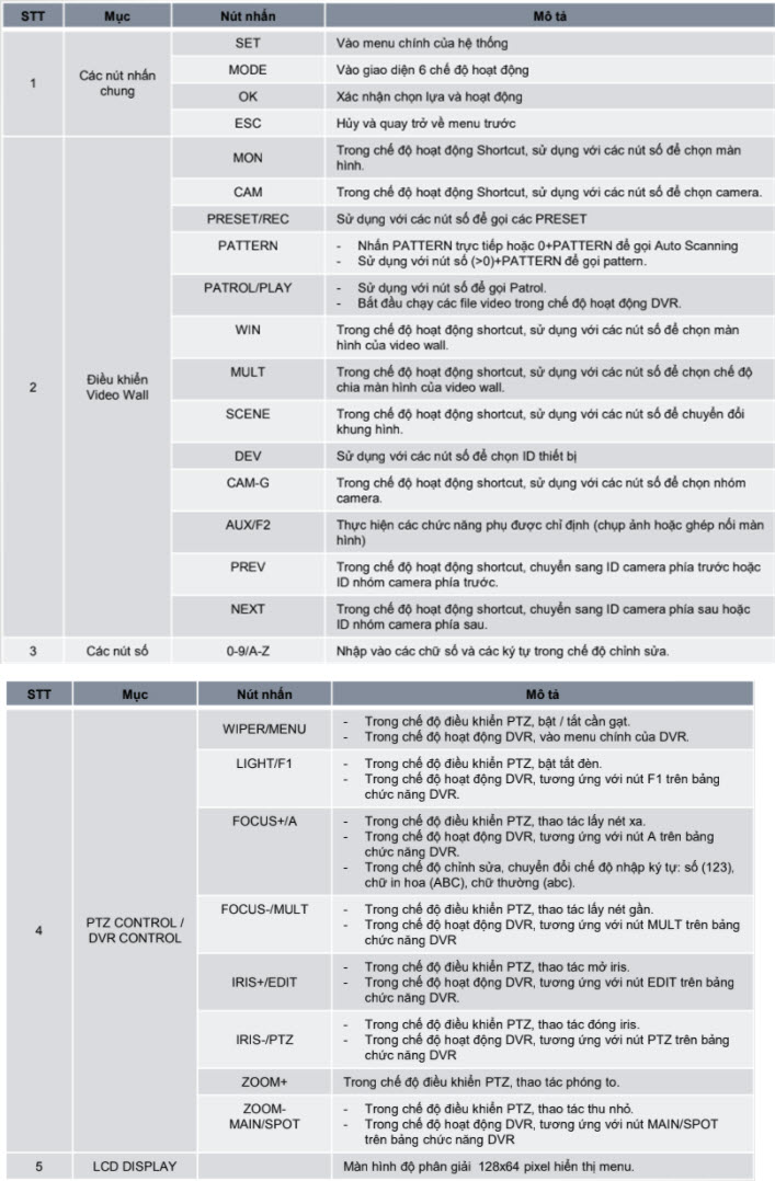 Bảng mô tả chức năng các nút nhấn.