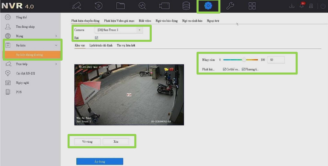 Bật lên --> vẽ full màn hình -->chỉnh độ nhạy --> Chọn các tác vụ liên kết theo ý muốn như phát hiện chuyển động.