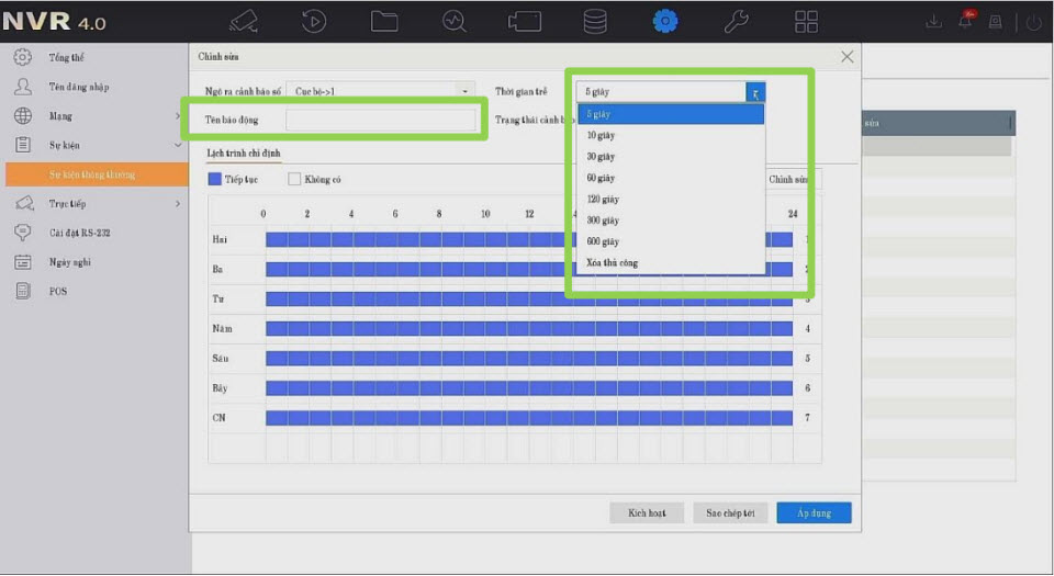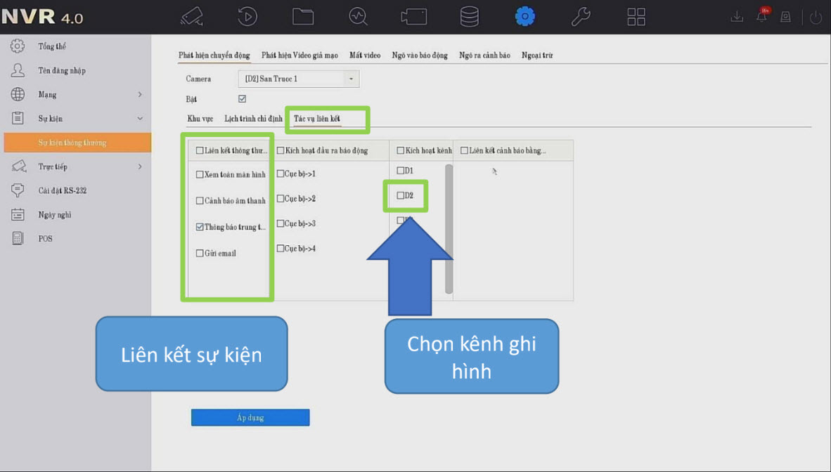 Kích hoạt kênh ghi hình: Chọn những camera muốn ghi hình khi có sự kiện