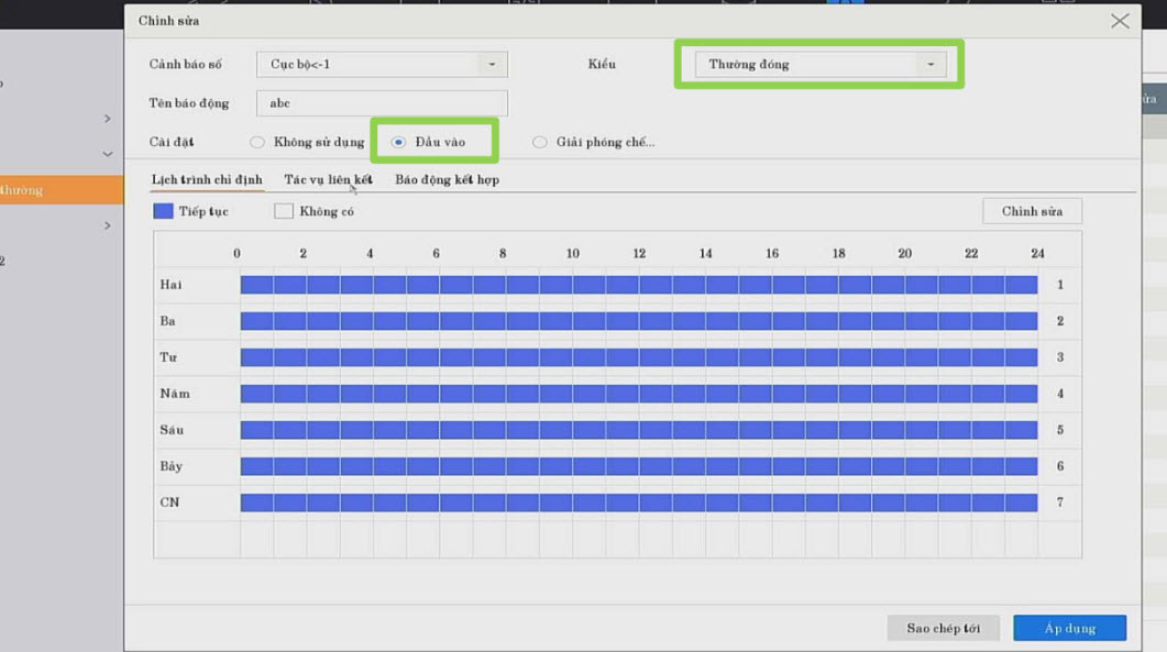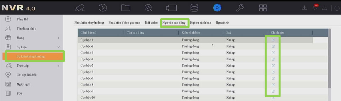 để vào cài đặt --> Chọn Sự kiện --> Chọn Sự kiện thông thường --> Chọn ngõ vào báo động.