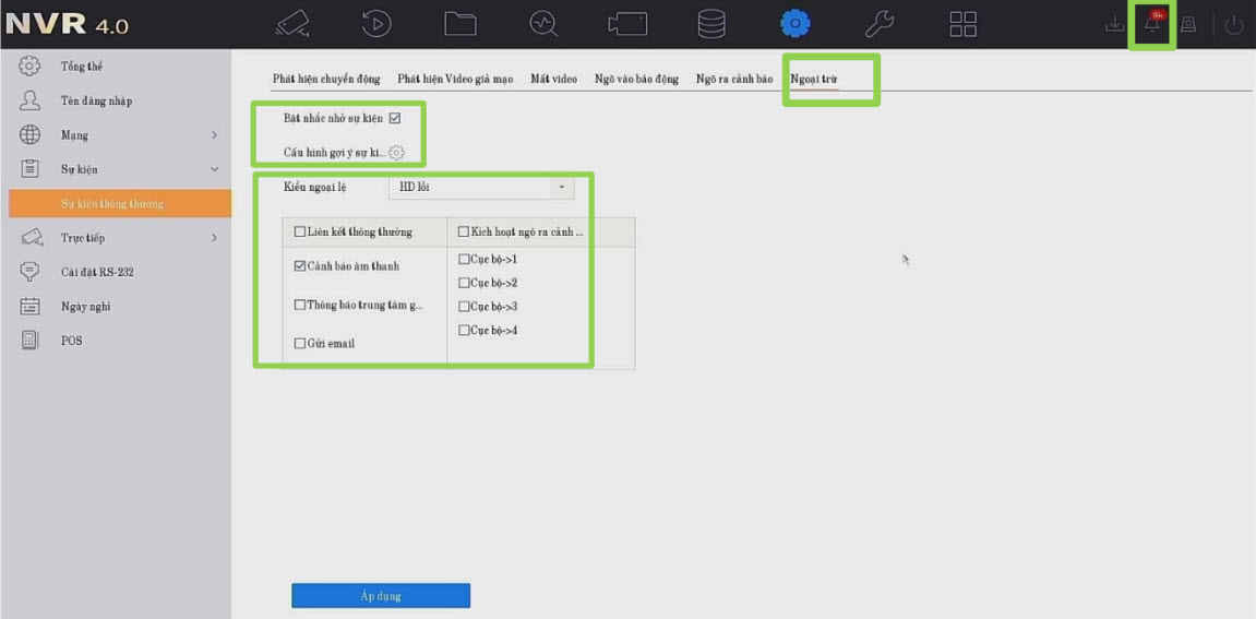 Kích hoạt ngõ ra báo động: kích các alarm out của đầu ghi, camera (nếu có).