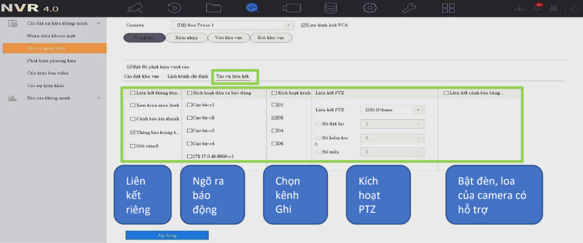 Tác vụ liên kết: Cài đặt các liên kết, Ngõ ra báo động kích hoạt ghi hình, điều khiển PTZ tương tự như cài sự kiện chuyển động