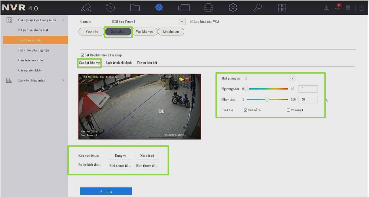 để vào cài đặt các sự kiện thông minh --> Chọn Bảo vệ ngoại Biên --> Chọn Xâm nhập